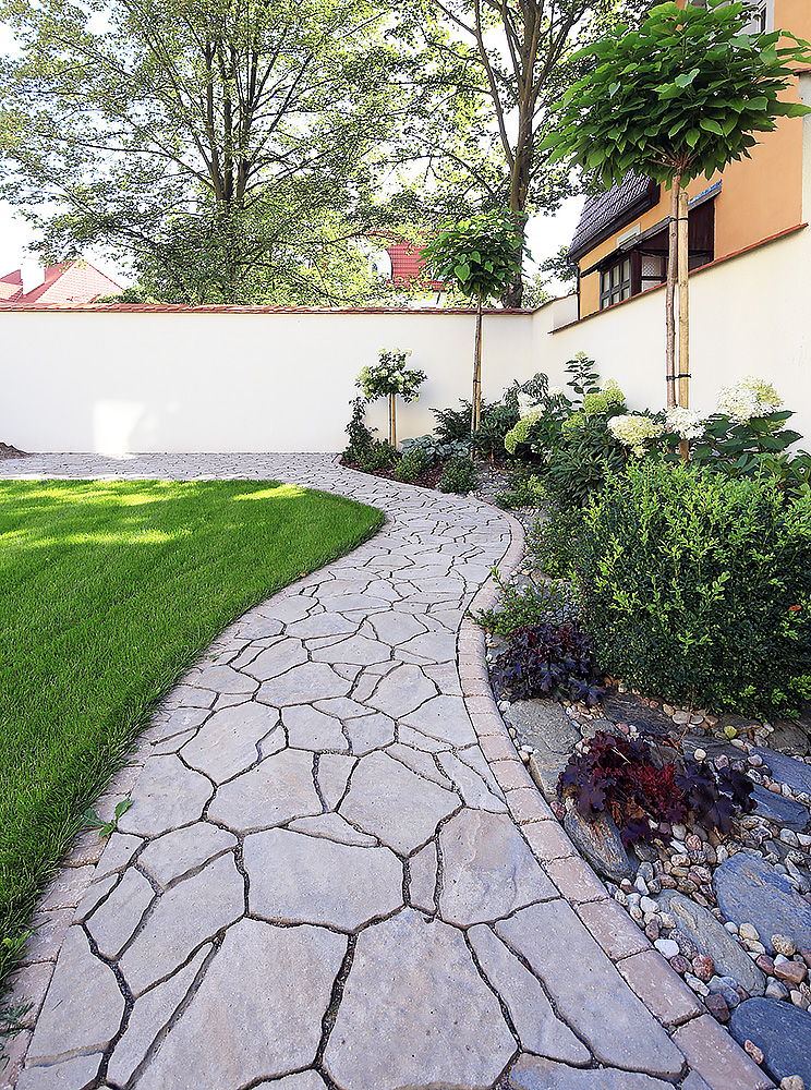 Alternatywą do klasycznych alejek w ogrodzie jest wykonanie ścieżek metodą step by step. Polega ona na układaniu prefabrykatów betonowych w pewnych odległościach od siebie i z lekkim przesunięciem, tak jakbyśmy stawiali kroki idąc na spacer. Decydując się na to rozwiązanie, należy pamiętać, że dystans pomiędzy poszczególnymi płytami nie może być większy niż 60 cm! To ważne, gdyż ma to decydujący wpływ na wygodę poruszania się po tego rodzaju deptaku. Do jego wykonania możemy użyć płyt Polbruk Linea przypominających fakturą i wyglądem trawertyn, czyli porowatą skałę osadową, z której wybudowano m.in. rzymskie Koloseum. Linea jest dostępna w dwóch kolorach: jasnoszarym i beżowym, które świetnie komponują się z intensywną zielenią trawnika.